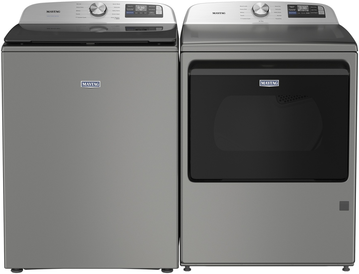 Maytag® Classic Silver Laundry Pair with 5.3 Cu. Ft. capacity top load washer and 7.4 Cu. Ft. capacity front load electric dryer with extra power.Read More